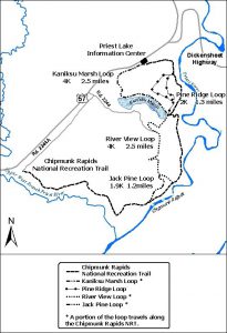At the 3-mile mark we switched to the Jack Pine Loop (it is signed; bear right), where Naughty went after her dearest prey–squirrels. This loop is rather short and quickly brings you to the intersection with the Chipmunk Rapids National Recreation Trail, signed as FR 2244.