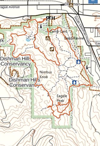 The 530-acre Dishman Hills Natural Area consists of a fir-studded rise dotted with ponds, granite rock formations, and several deep parallel ravines. It is almost entirely surrounded by residential housing and accessible from three sides. There are many loops, ranging from a short quarter-mile stroll to this 7-mile loop encompassing both the inner and outer trails.