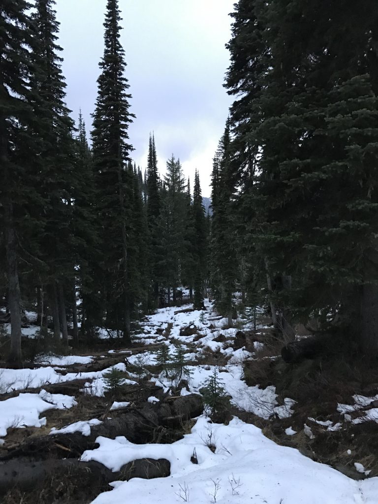 Crossing a creek in the lower third of the hike (this is not Gem Creek, though; this trail never intersects Gem Creek)Frequent crossings of small brooks (likely seasonal)The trail is well-maintainedView of the Pend Oreille Divide in the backgroundWe ran into snow at around 5600 feet.Up, up, up!A lower lake (pond, really) just beneath the brim of Gem LakeView of inlet of Gem LakeView of outlet of Gem LakeGem LakeThe snow was a foot deep at Gem LakeView of Mount Pend Oreille in dying light