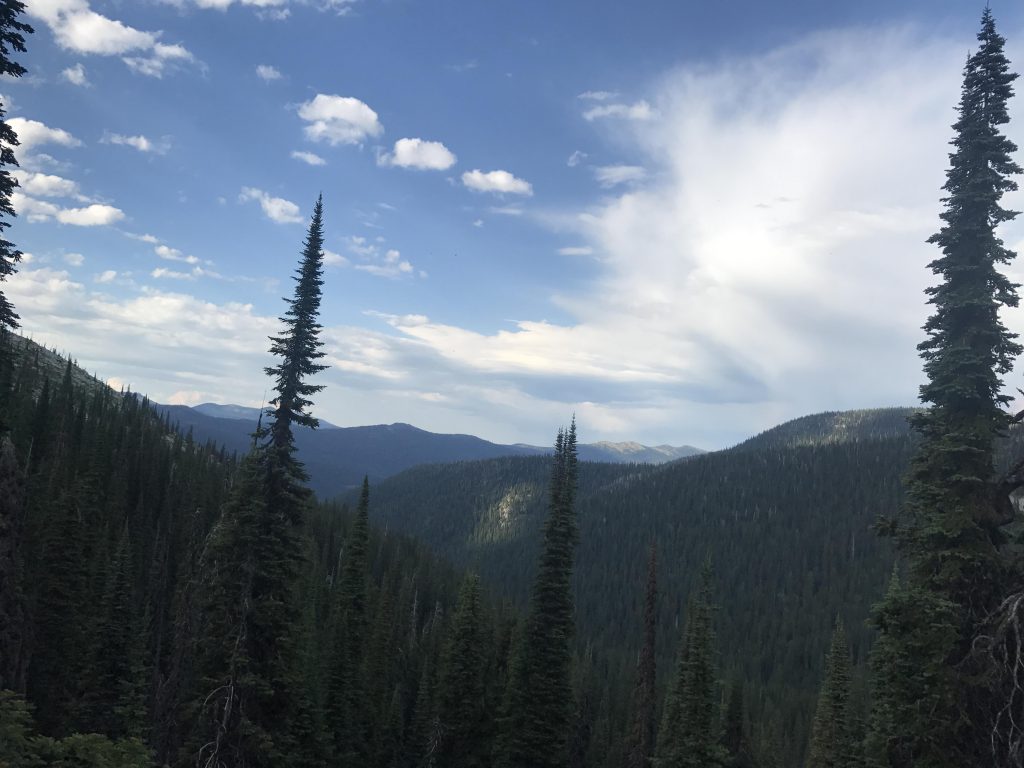 There are a fair number of switchbacks, but the trail is really quite easy to walk on, the steeper walls lined with boulders like landscaping blocks. After three miles you’ll emerge onto a basin beneath Harrison Peak and the trail heads westwards, mostly flattish or even a bit downhill, for another mile. Tree-cover is light here, and you get a few unfiltered views of the Seven Sisters and Twin Peaks to the left and Harrison Peak to the right.